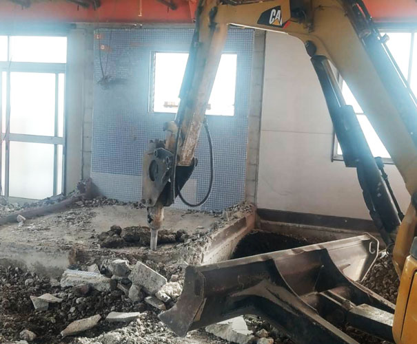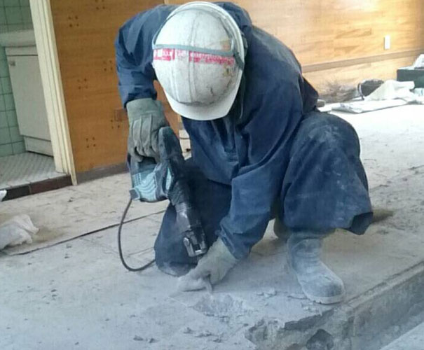 薬液を使用してコンクリートの破砕を行います。低振動・低騒音が特徴です。穿孔したコア孔に静的破砕剤を充填し、化学反応によりコア孔内部が膨張してコンクリートを破砕します。